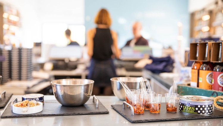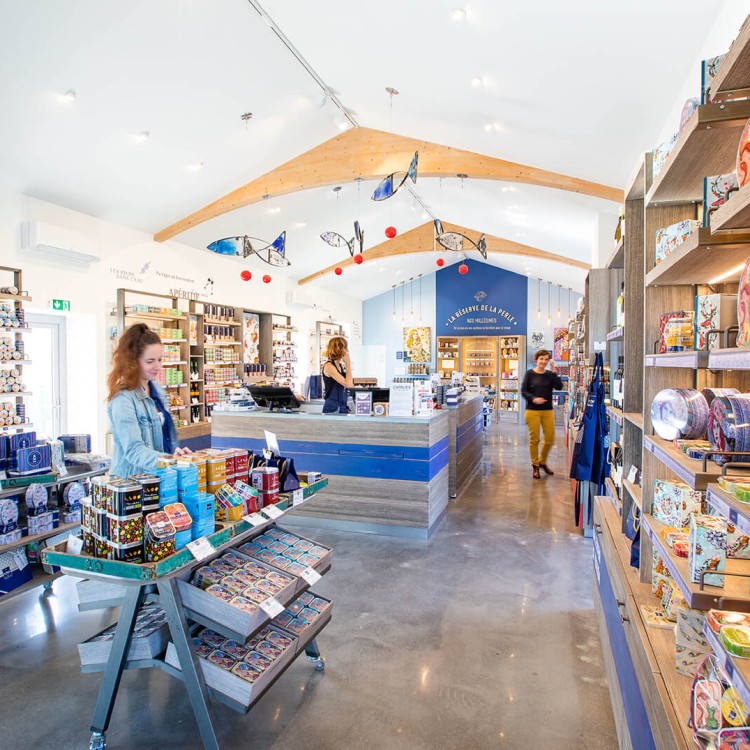 L’Atelier de la Sardine accueille également notre plus grande boutique. Cet espace a été conçu avec des matériaux nobles comme le bois ou le zinc permettant de retranscrire le milieu naturel de la pêche et des bateaux. Galérien, Harissa, Jérémy Simon… les plus observateurs pourront retrouver les noms de notre flotte de pêche dans cette belle boutique.